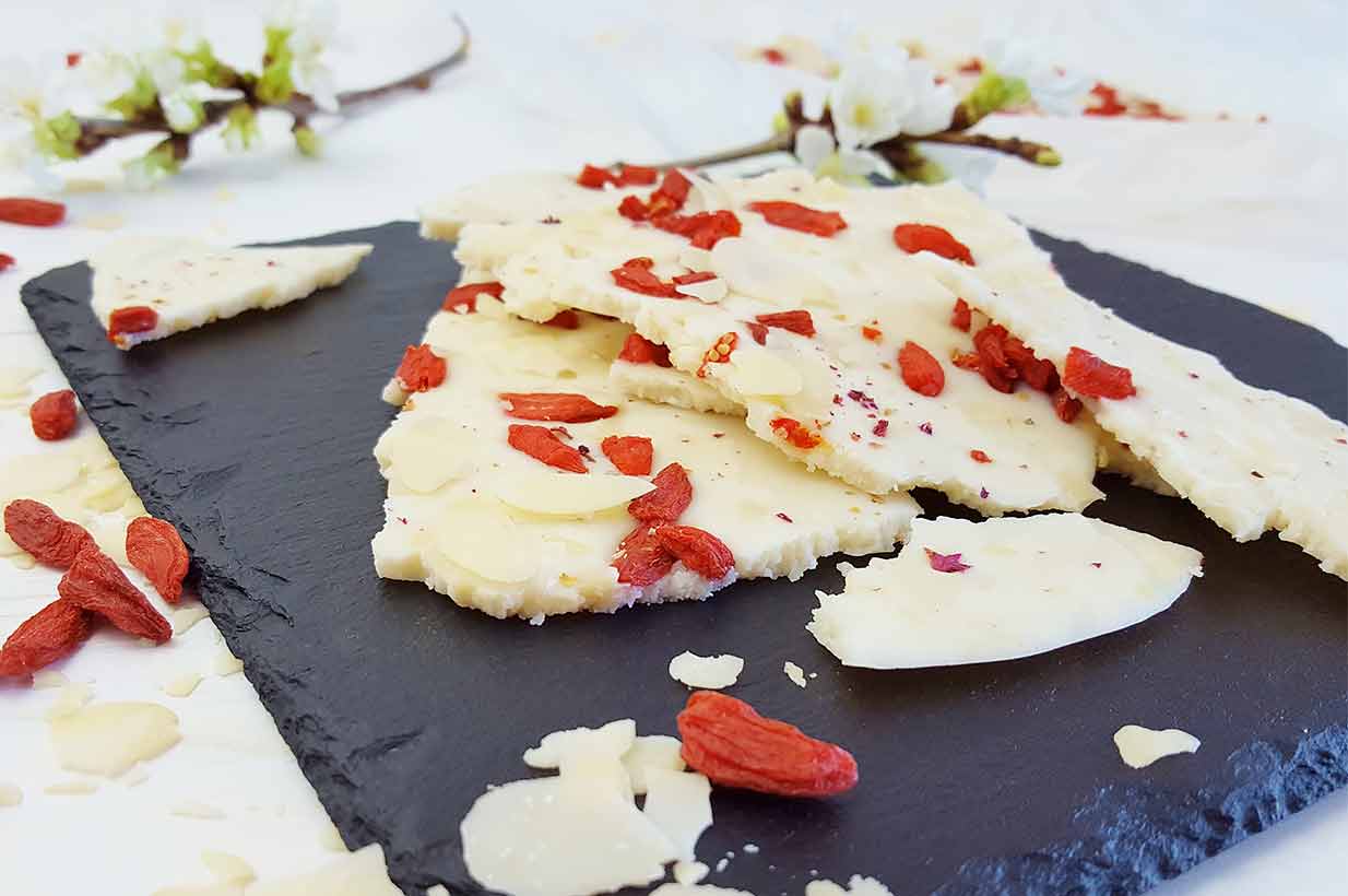 Dieses DIY Rezept für weiße Schokolade ist vegan und zuckerfrei. Gojibeeren zaubern noch einen fruchtigen Akzent zum zartschmelzenden Schokoladengenuss!