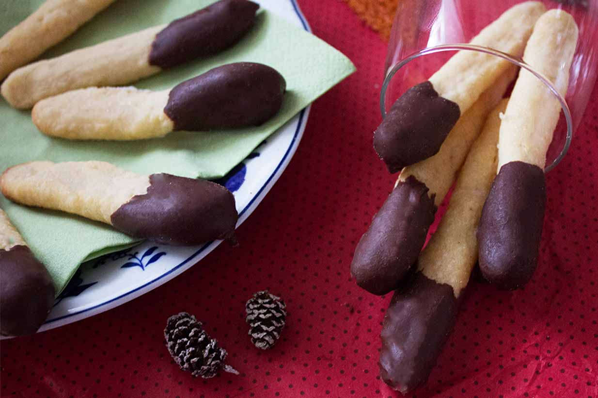 Abschließend eine Hälfte der Zitronenstangen in die geschmolzene Schokolade tauchen. Zum Trocknen kalt stellen.