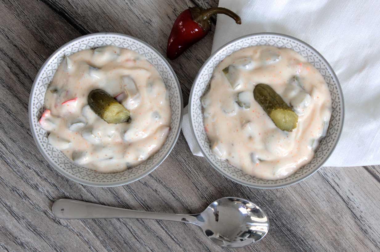 Danach die vegane Mayonnaise mit dem Saft der Essiggurken und dem Birkengold Xylit zusammenmischen.