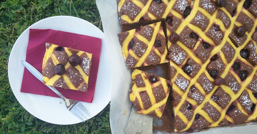 Blechkuchen mit WOW-Effekt gesucht? Dieser zuckerfreie Gitterkuchen mit Topfen und fruchtigen Kirschen ist dafür ideal. Schon probiert?